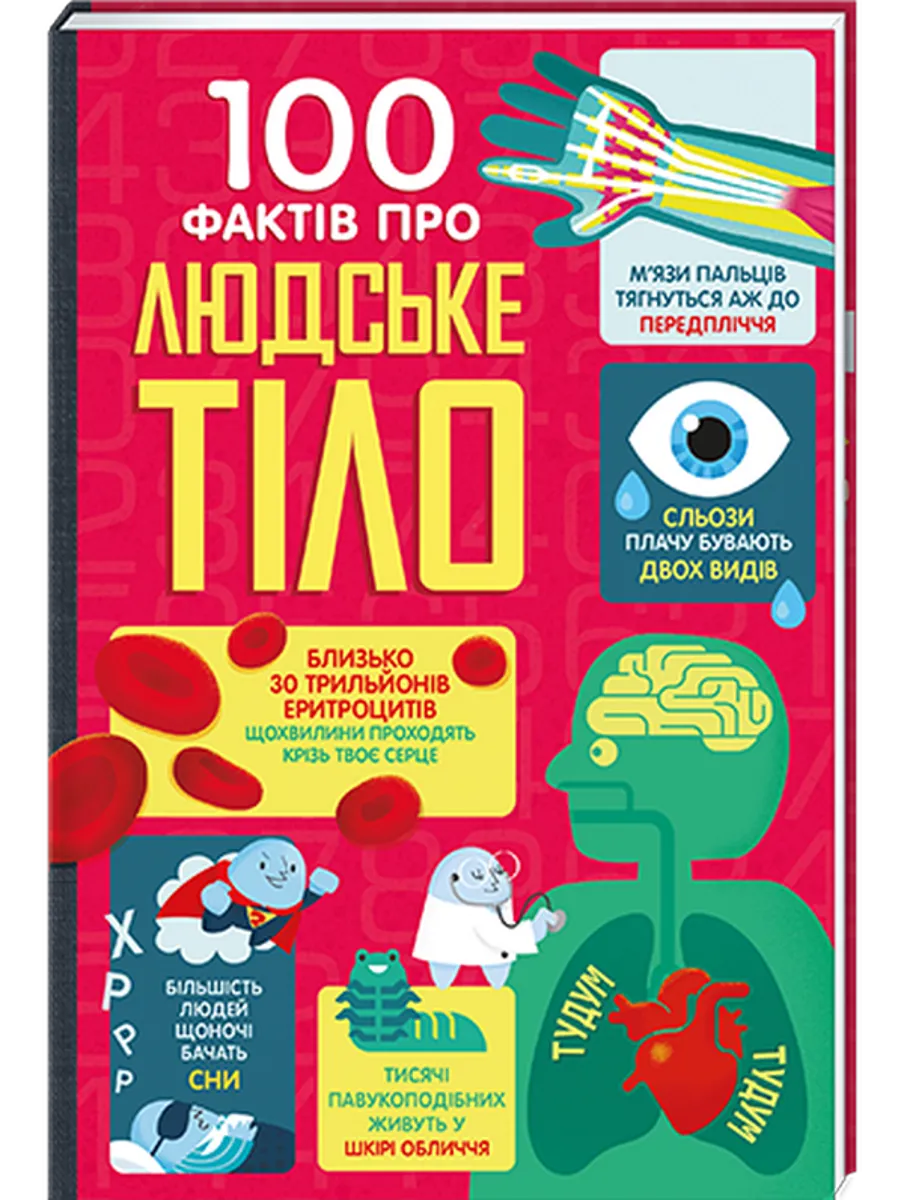 Біологія необов’язково мусить бути складною і незрозумілою. Це доводять автори науково-популярного видання «100 фактів про людське тіло», які пояснюють будову тіла та всі процеси в ньому у форматі захопливого сторітелінгу, через ілюстрації та вражаючі факти. Виявляється, є два типи сліз, за життя людина витрачає на сон 23 роки життя, вдихає 650 мільйонів разів, у неї виростає 950 км волосся, це відстань від Парижа до Лондона і назад. Людина скидає протягом життя 45 кг шкіри, а слини виділяє стільки, що можна заповнити бензовоз, а на шкірі нашого обличчя живуть тисячі павукоподібних. Зуби – міцніші за сталь, а якщо тренуватись, то можна затримати дихання на 20 хв, а щоб найкраще щось вивчити слід лягти спати, під час сну мозок пригадує все вивчене протягом дня. З цією книжкою можна організувати вікторини у школі чи вдома. Переможець Sainsbury's Children's Book Awards 2017 у номінації «Навчання та Розвиток». «100 фактів про людське тіло» – сьома книга із серії, раніше у видавництві вийшли: «100 фактів про планету Земля», «100 фактів про історію», «100 фактів про числа, комп’ютери та програмування», «100 фактів про космос», «100 фактів про їжу», «100 фактів про науку».