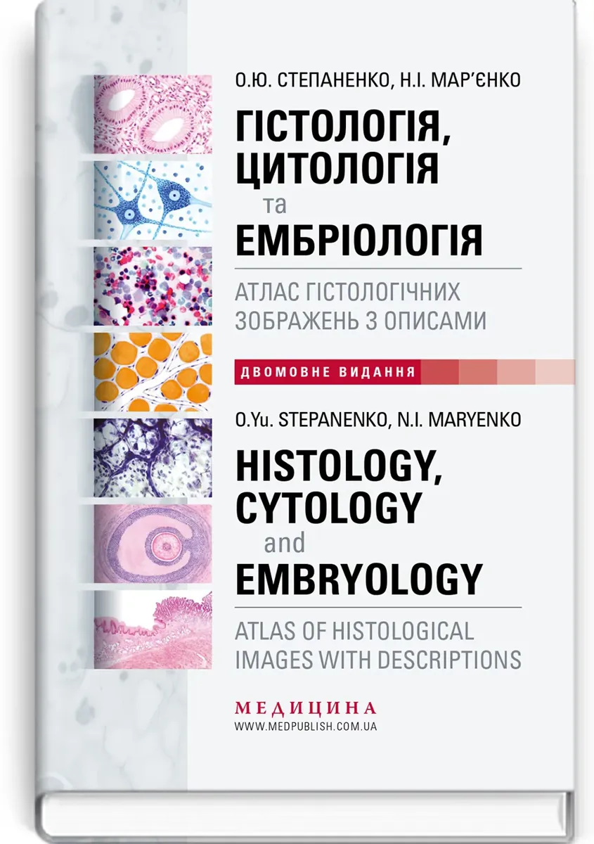 • Навчальний наочний посібник підготовлено співробітниками кафедри гістології, цитології та ембріології Харківського національного медичного університету. Видання укладено з урахуванням програми медичних спеціальностей вищих навчальних закладів України. • Всі терміни наведено відповідно до міжнародних гістологічної та ембріологічної номенклатур. • Цей атлас гістологічних зображень поєднує оригінальні авторські малюнки та мікрофотографії гістологічних препаратів, що використовуються при вивченні гістології, цитології та ембріології в Україні. Малюнки гістологічних препаратів є простими для візуального сприйняття та зрозумілими, особливо при першому ознайомленні з матеріалом, а мікрофотографії дають можливість побачити структури саме такими, якими вони виглядають під мікроскопом. • До ілюстрацій наведено пояснювальний текст і перелік умовних позначок українською та англійською мовами. • Поєднання української та англійської мов робить цей навчальний наочний посібник корисним для опанування медичної термінології англійською мовою. • Атлас призначений для здобувачів освіти та викладачів вищих навчальних закладів — медичних університетів, інститутів і академій, лікарів різних спеціальностей та біологів. Це видання можна використовувати як для вивчення теоретичного матеріалу з гістології, цитології та ембріології, так і в якості візуального гіда для опанування практичних навичок під час роботи з мікропрепаратами та мікроскопом.