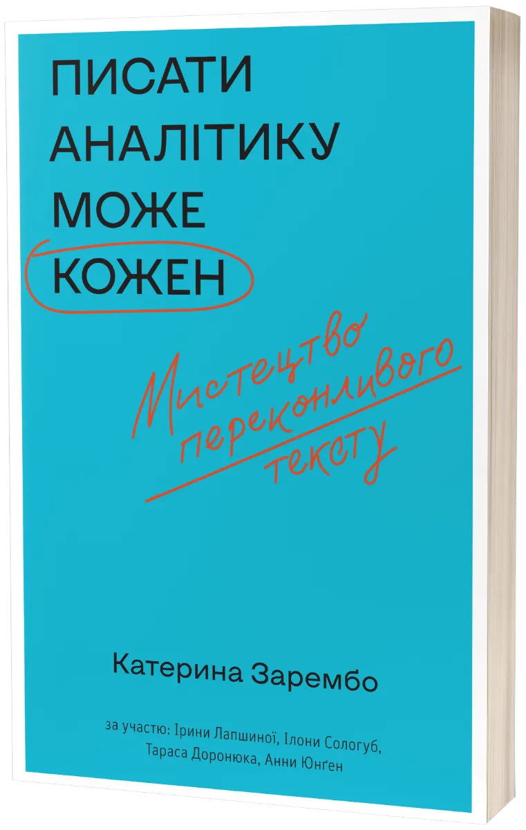 Існує думка, що нудний, сухий, перевантажений складнопідрядними реченнями текст — серйозний, а легкий і приємний для прочитання — ні. Однак це не так. Аналітичний текст може бути елегантним та захопливим, а головне — спричиняти зміни у діях чи свідомості. Вміти писати такий текст — корисна навичка у сучасному світі. У цій книзі аналітикиня Катерина Зарембо та група дослідників Національного університету «Києво-Могилянська академія», Українського Католицького університету та Київської школи економіки привідкривають завісу над роботою аналітиків, розбираючи аналітичний текст від задуму та призначення до структури та оцінки його ефективності. Автори покажуть, як провести необхідний дослідницький аналіз, вибудувати аргументи, обрати стиль написання та не лише зацікавити, але й переконати свою аудиторію. Катерина Зарембо — аналітикиня з питань зовнішньої політики України, тренерка з написання аналітичних матеріалів, асоційована аналітикиня Центру «Нова Європа», викладачка кафедри міжнародних відносин Національного університету «Києво-Могилянська академія». Над книжкою також працювали: Ірина Лапшина, Ілона Сологуб, Тарас Доронюк, Анна Юрґен. Посібник підготовано в межах Ініціативи з розвитку аналітичних центрів в Україні, яку впроваджує Міжнародний фонд «Відродження» у партнерстві з Ініціативою відкритого суспільства для Європи (OSIFE) за фінансової підтримки Посольства Швеції в Україні.