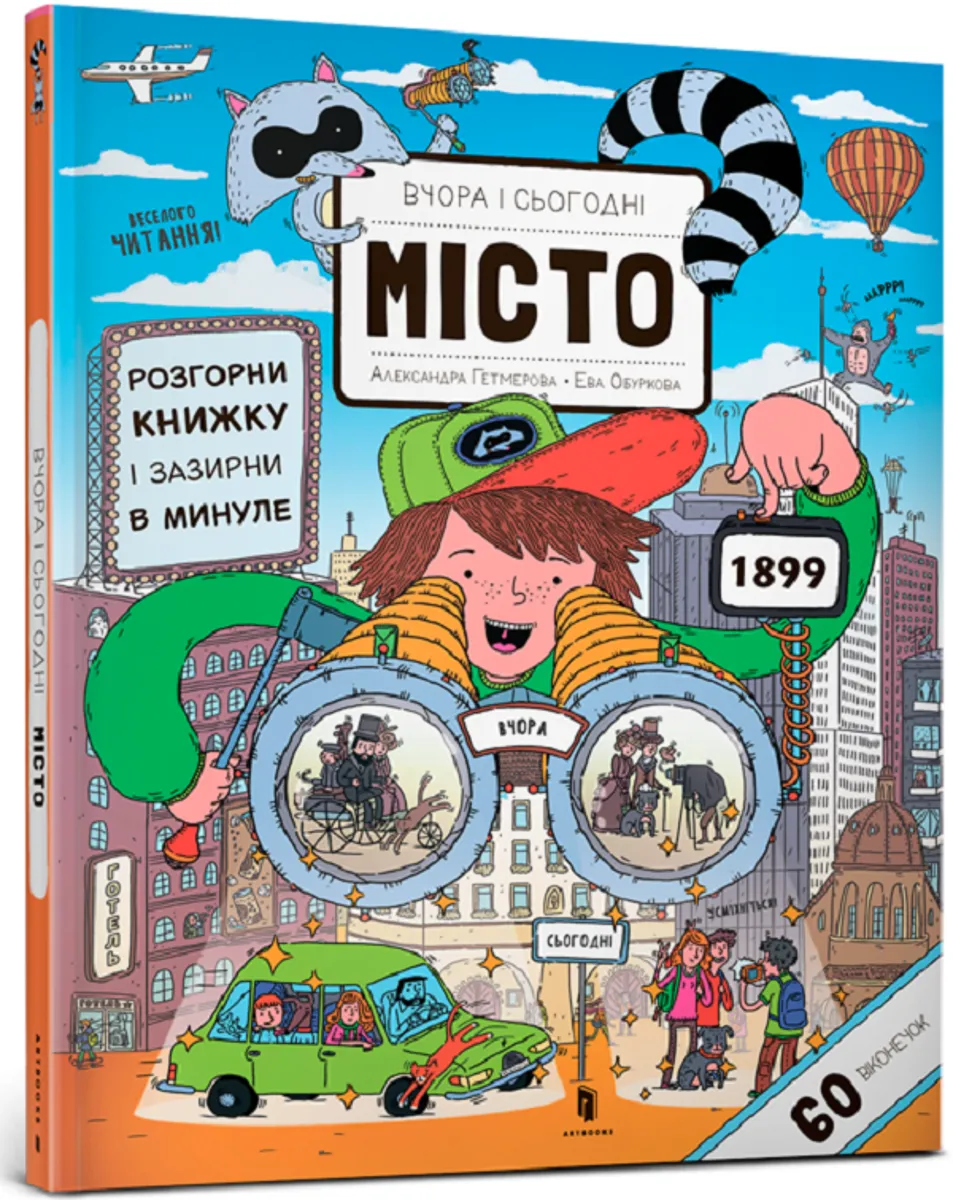 Чи ти коли-небудь замислювався про те, як жили раніше? Яким був перший автомобіль або прототип підводного човна? Що носила до школи бабуся, коли була ученицею, на яких роликах катався твій прапрапрапрадід? Який одяг носили сто років тому? А тисячу років? Ще ніхто не винайшов машину часу, але разом з нами повернення в давнину стає грою, бо саме для тебе в нас є чарівний бінокль! Якщо тобі цікаво дізнатися про звичайний день у місті, про його магазини, транспорт, дозвілля в парках, зимові розваги, літній відпочинок на пляжі або про шкільне життя, то просто зазирни в одне з кількох десятків віконечок на сторінках цієї книжки. Допитлива єнотиха Аґнеса теж уважно все вивчатиме. Спробуй знайти її на всіх картинках.